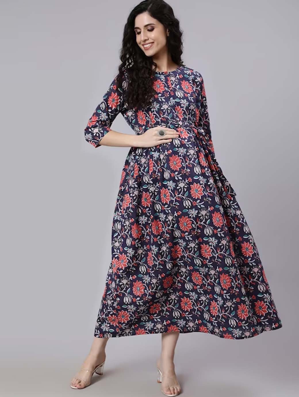 Blue floral print maxi dress Round neck Three-quarter, regular sleeves Maxi length in flared hem Cotton fabric Concealed zip closure