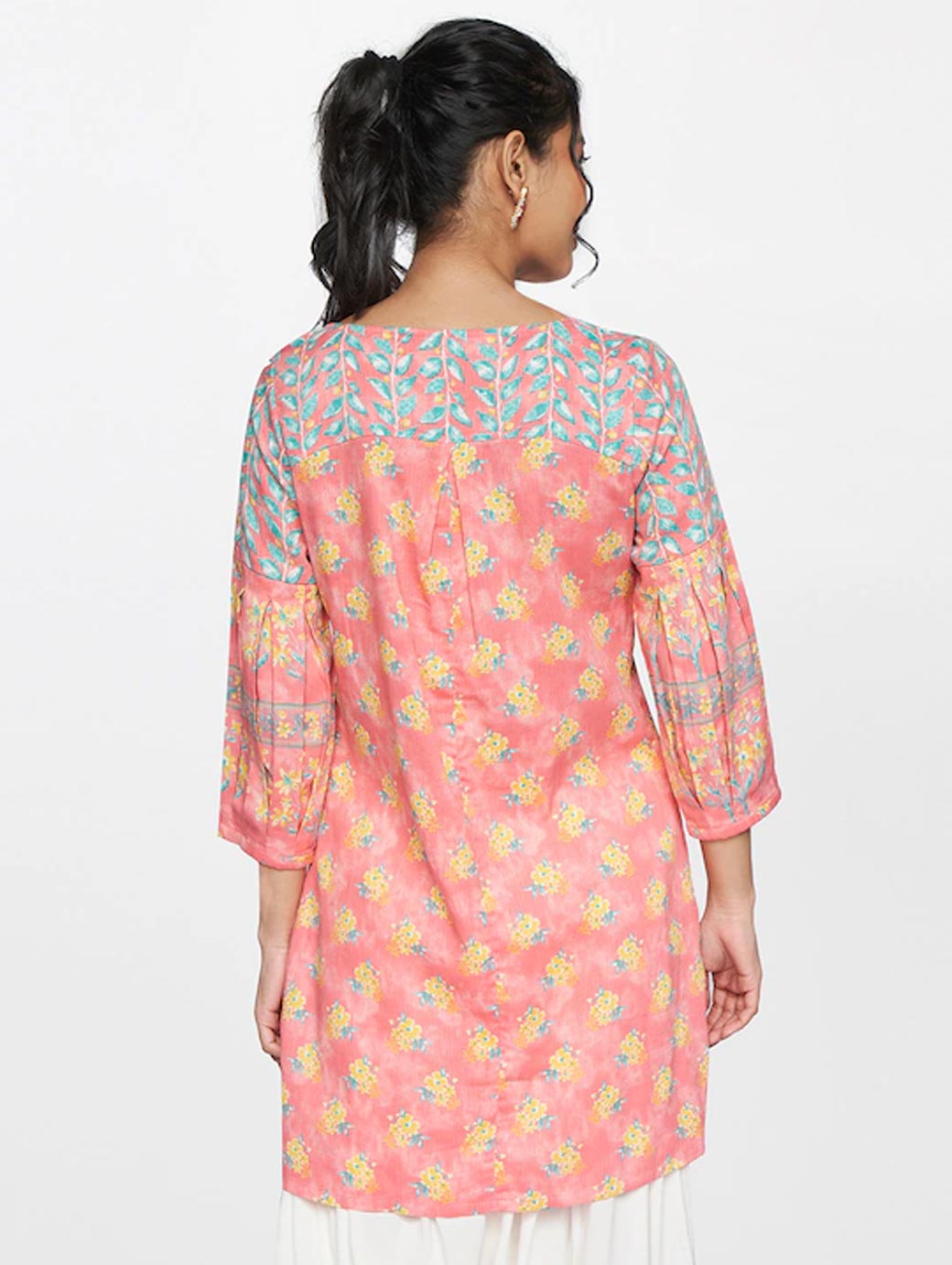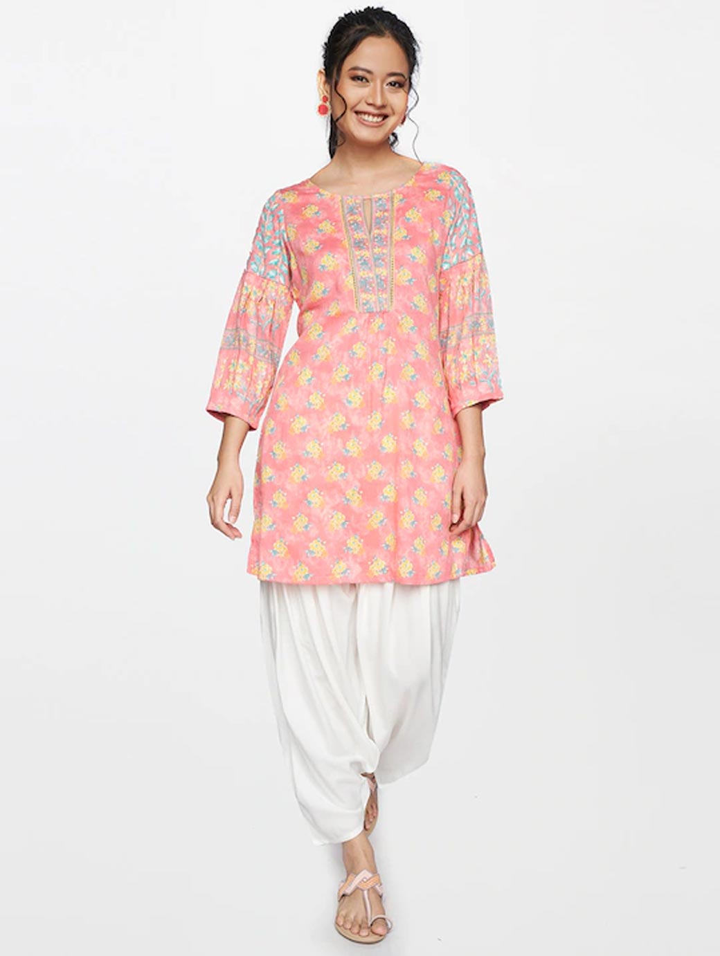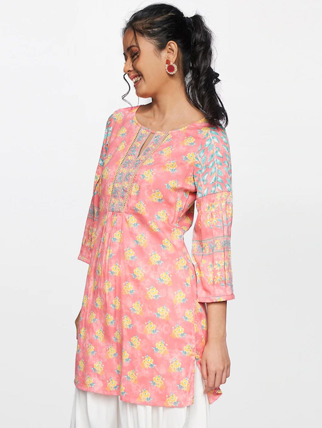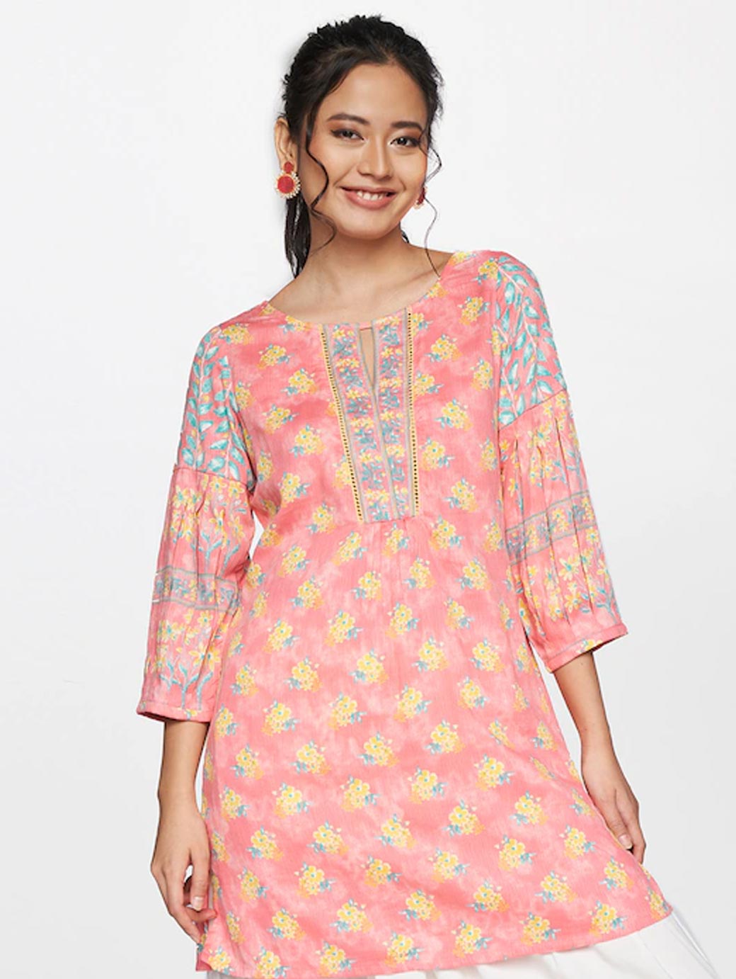 Pink and yellow floral printed tunic ,has a round neck, three-quarter sleeves.