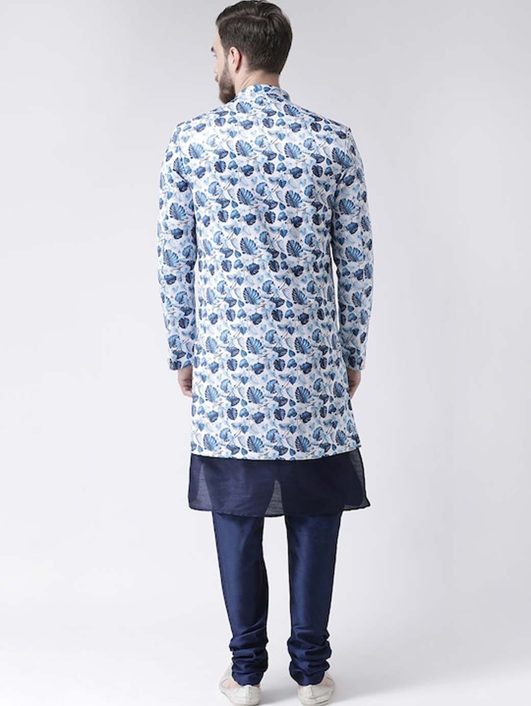 Blue and white printed achkan with blue solid kurta and churidar Blue and white printed achkan, has a mandarin collar, long sleeves, a full button placket, asymmetric hem, and multiple slits Blue solid kurta, has a mandarin collar, a short button placket, long sleeves and side slits Comes with a pocket square Blue solid churidar, has a drawstring closure. Disclaimer: Pocket square color can vary from the images.