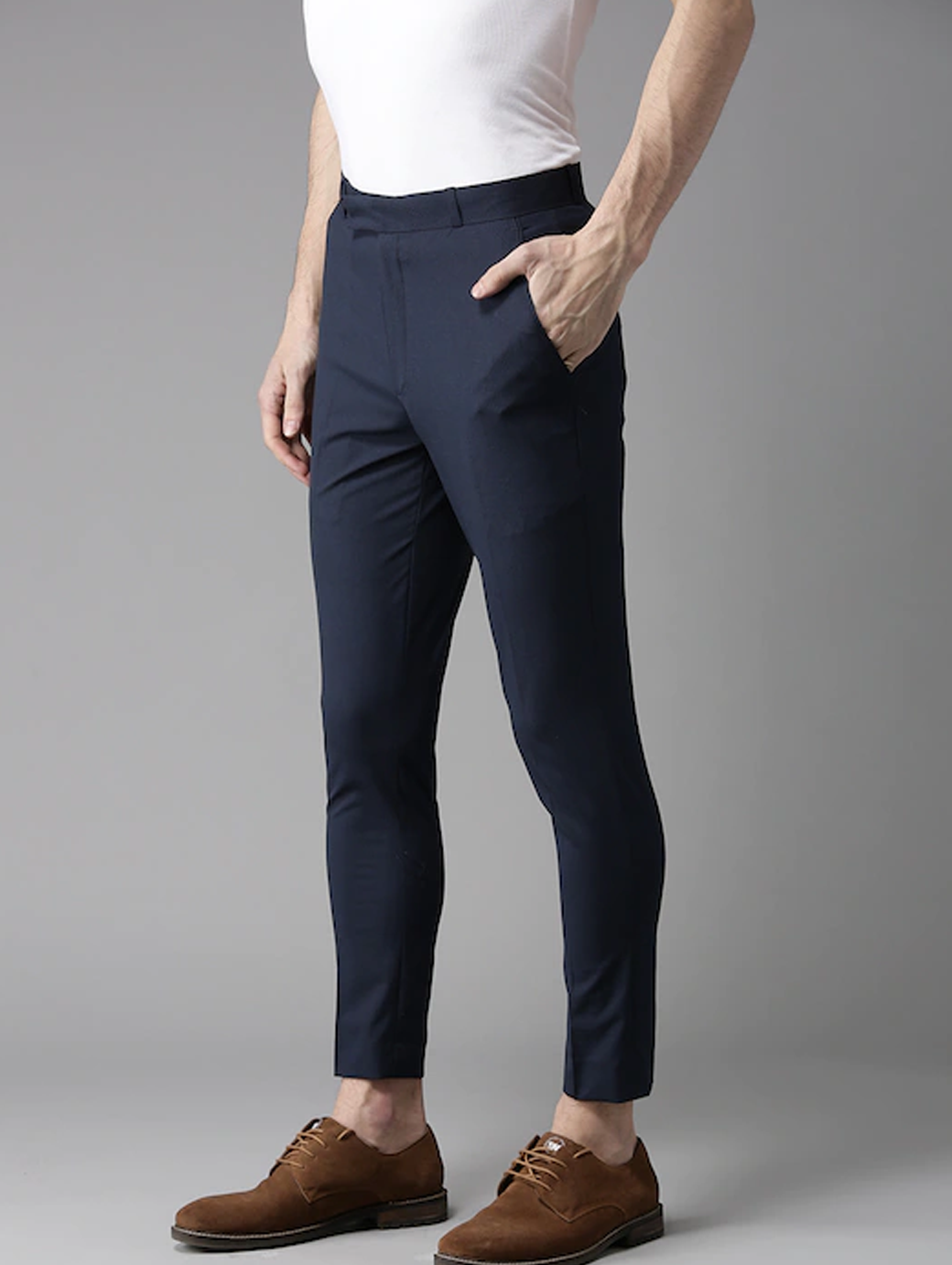 Navy Blue solid mid-rise trousers, has a hook and bar closure, four pockets
