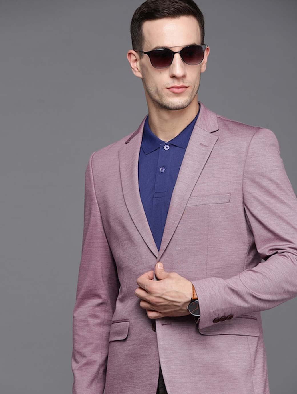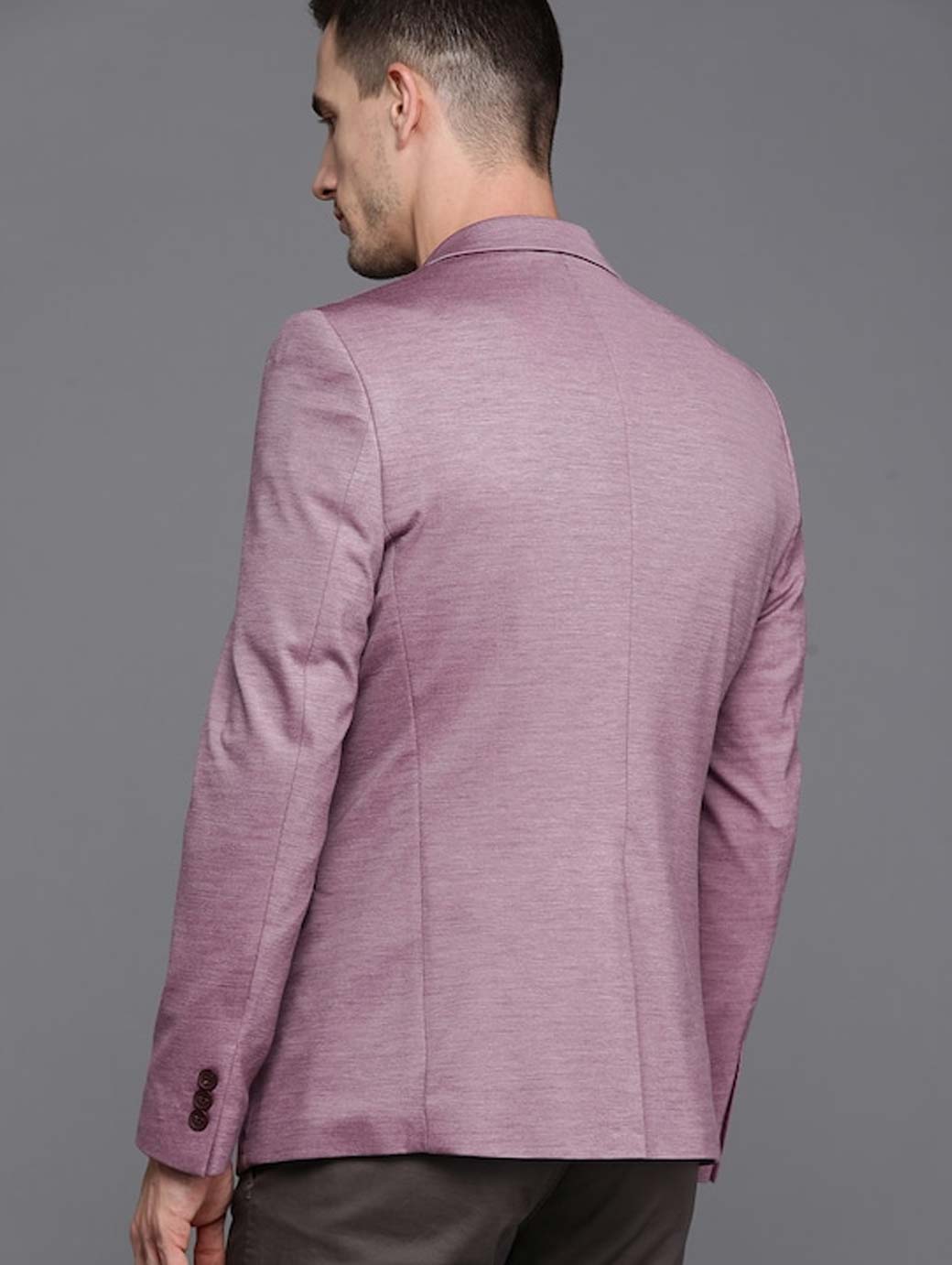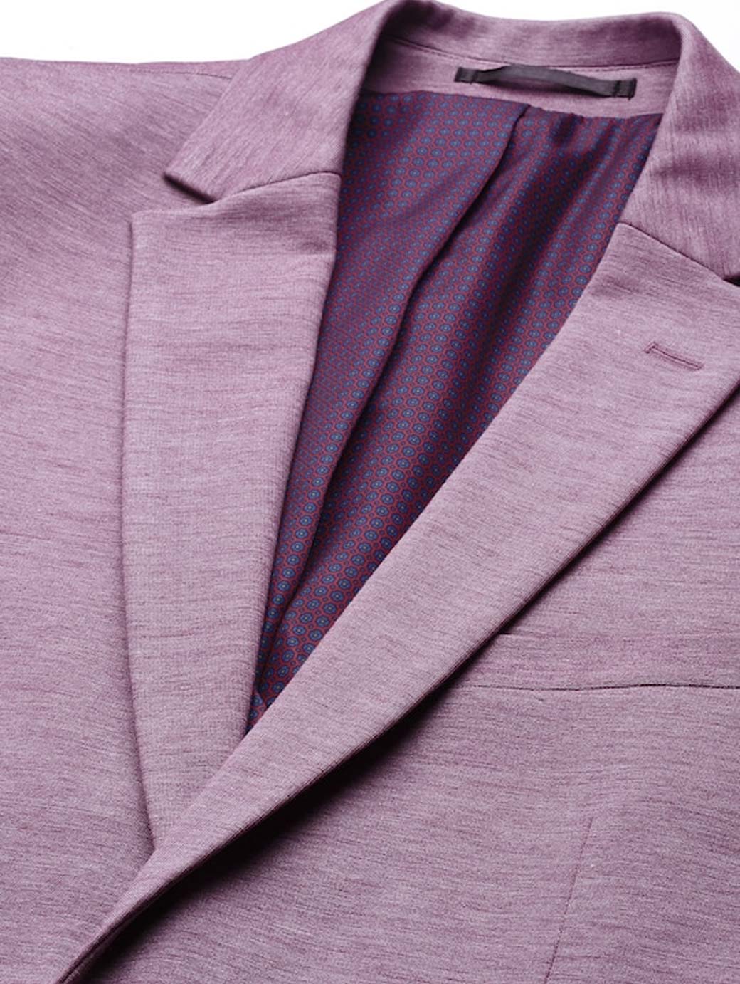 Purple solid with melange effect smart casual blazer, has a notched lapel collar, long sleeves with buttons, single breasted with button closures, 4 pockets, attached lining, and a single vent back hem