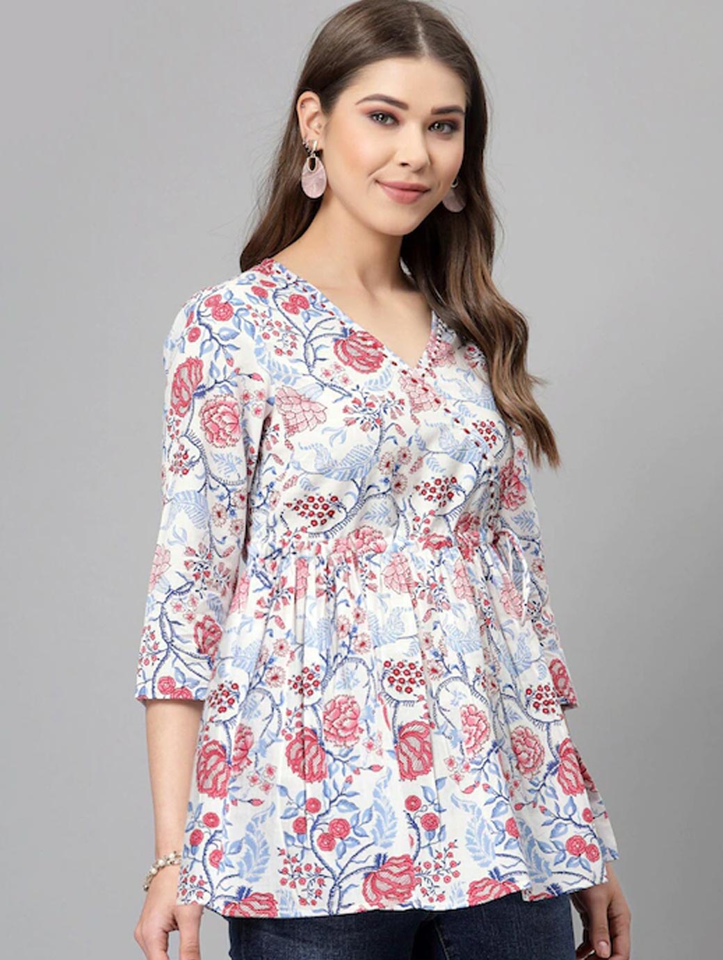 White and red longline wrap top Floral print V-neck, three-quarter, regular sleeves Gathered or pleated detail Woven cotton Tie-ups closure.