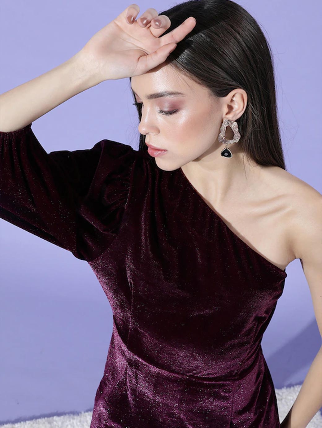 Deck up your wardrobe with this gorgeous dress. To add to the charm, this dress features a lovely one-shoulder and three-quarter bishop sleeves. Deep burgundy shade, Classic solid pattern, One-shoulder, Three-quarter bishop sleeves, Polyester, machine wash, Trend Alert, One-shoulder style features a garment with a single shoulder, leaving the other shoulder bare. This bold style draws attention away from the lower body, emphasising the neck and shoulder area.